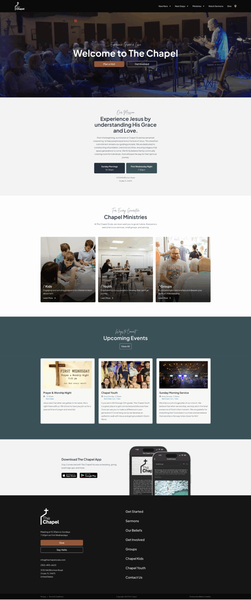 The Chapel is a church in Ocala, Florida with a mission to help people find grace and love. They came to Bellow for a full website rebuild that felt modern, welcoming, and genuinely useful for both longtime members and first-time visitors. The new site serves as a central hub where members can watch sermons, stay connected, and follow weekly updates, while visitors get a clear sense of what to expect before they walk through the doors. We also integrated Planning Center Online so their team can easily manage events, groups, and updates without ever touching the backend.